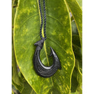 Hand carved black Jade Makau necklace with engravings on front of hook. This Fish Hook or also known as Makau in the islands, represents strength, prosperity, abundance and great respect for the Sea. Also the belief the Makau provide safe journeys on the Sea. Comes with black braided cord that adjusts for perfect sizing.