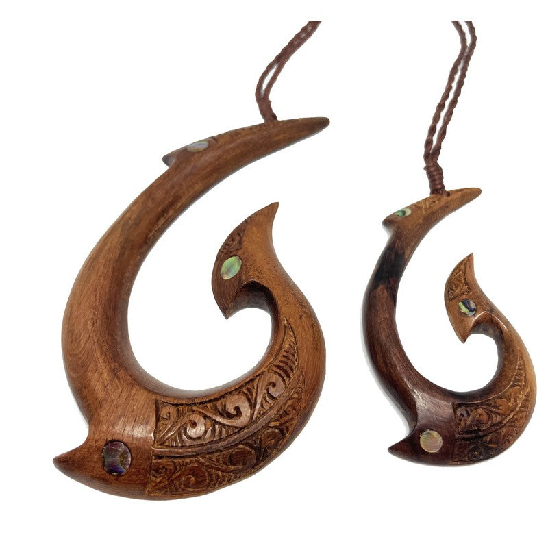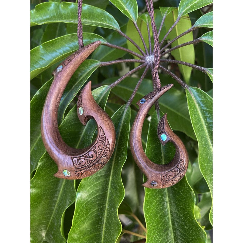 Expertly crafted from Sonokeling wood, this Hawaiian Makau necklace features detailed engravings and striking abalone shell accent. The rich brown tone and unique patterns of each piece embody the traditional spirit of the islands. Available in two sizes, this necklace showcases expert craftsmanship and authentic design. See sizing options below.