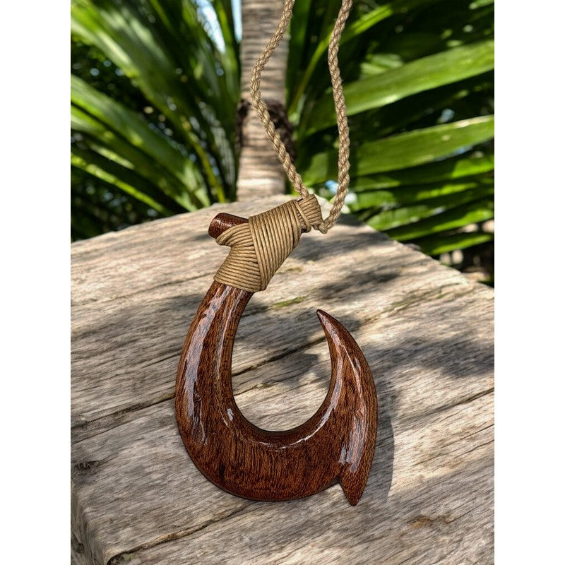 Experience the beauty and tradition of Hawaii with this handcrafted Makau fish hook, carved from rich, natural Koa wood. Each piece comes with a durable braided cotton cord and an adjustable sliding knot for a perfect fit.