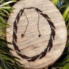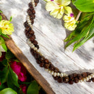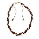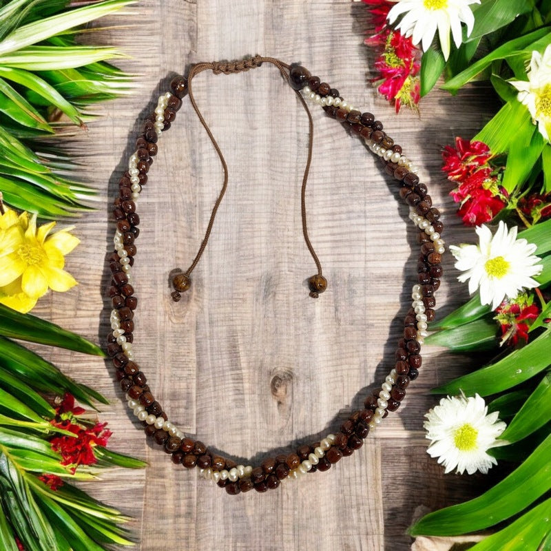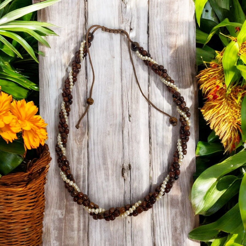 Three Strand Hawaiian Koa Wood Adjustable Necklace featuring fresh water pearls. With two strands of beautiful Hawaiian Koa Wood Beads and one pearls, it exudes a unique Island-Style look, making it a favorite at Makana Hut.