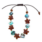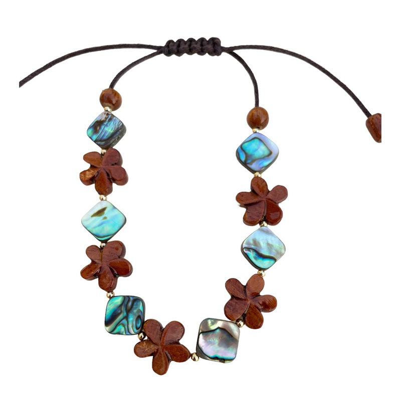 A beautiful Koa Wood adjustable bracelet featuring Hawaiian Plumeria Flowers and Paua Shells (Abalone) with clasp closure. Designed in Hawai'i with aloha and care.