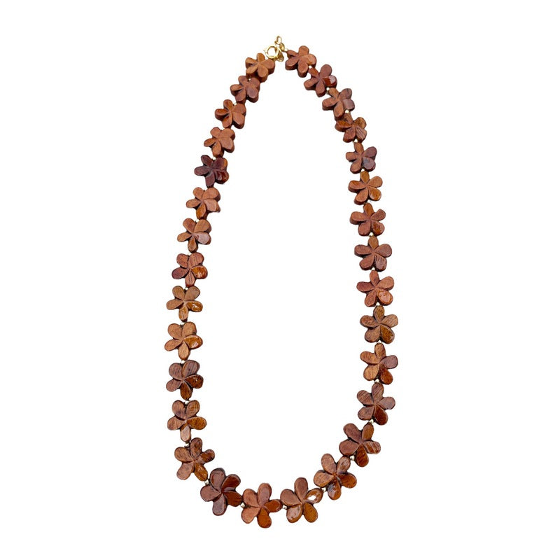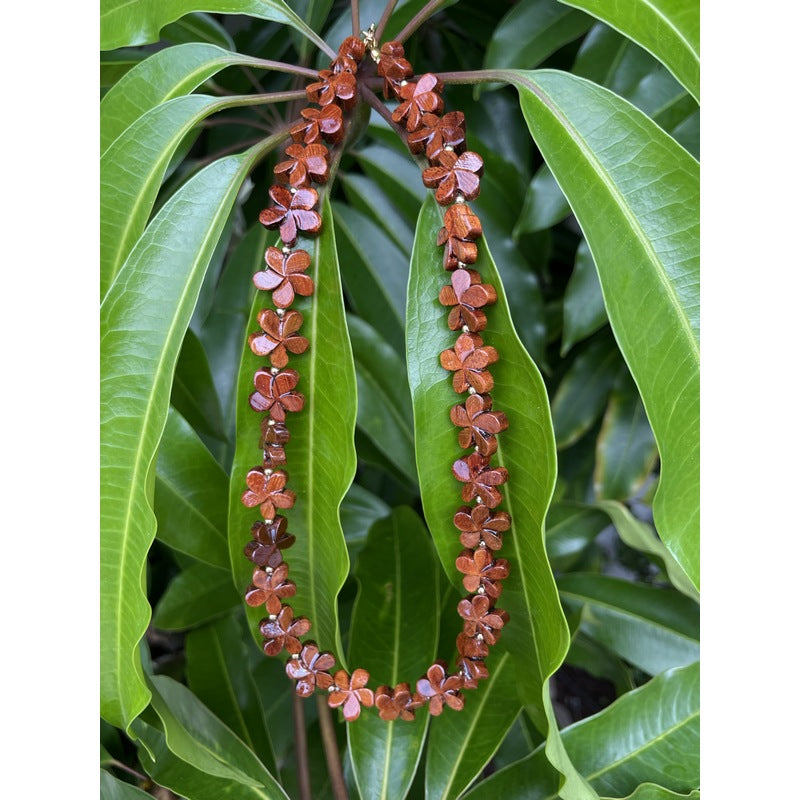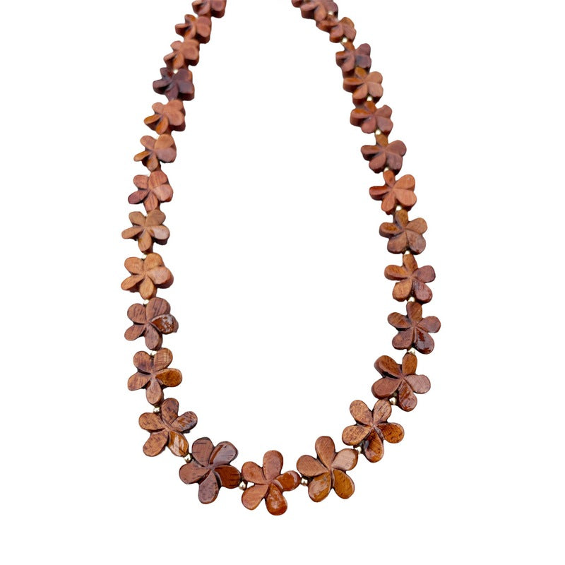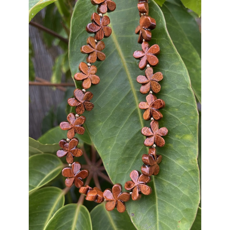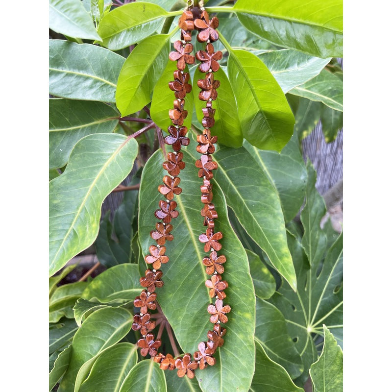 Hawaiian Plumeria Flowers made of Koa Wood make this a stunning necklace and shows the beauty of an Island lei handcrafted in Hawaiian Koa. Features a clasp closure and have two sizes to choose from. Approximate sizes of 16" or 18"