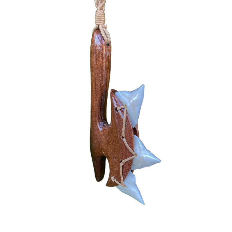 Hawaiian Koa Wood Axe Club Necklace featuring three shark teeth. This replica of a traditional Hawaiian or Polynesian weapon was handcrafted from the beautiful Koa Wood that is so loved in the Islands.