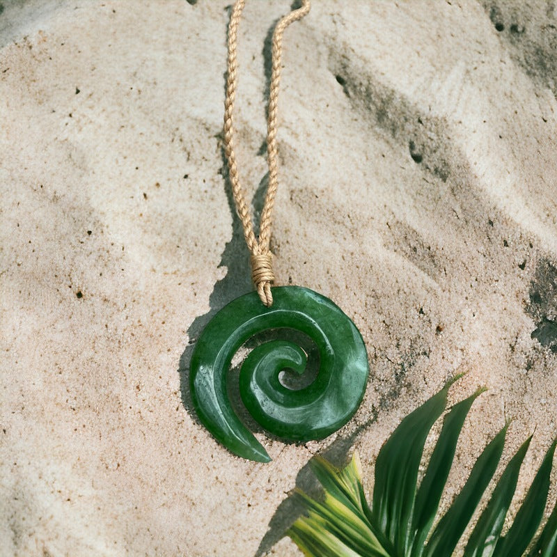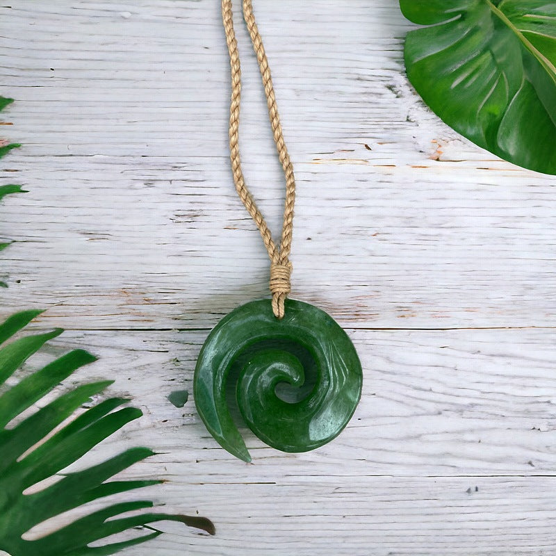This beautiful handmade necklace features a jade Koru, or spiral design, symbolizing the unfurling fern frond. The Koru represents new life, purity, and growth, while the outer circle reflects the cycle of life. It is also a symbol of peace, tranquility, spirituality, family, and new beginnings.