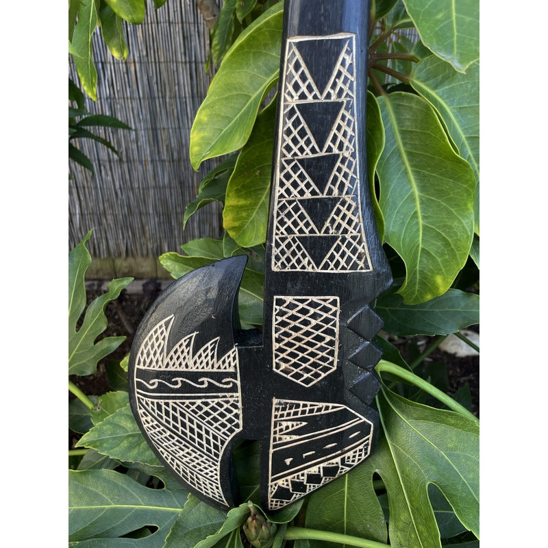 A beautiful Polynesian Replica Club with carvings throughout and painted black. This club could do some serious damage way back when, but now it's a beautiful Polynesian Heritage piece of artwork. This replica measures approximately 20 INCHES long and is carved from single piece of wood. Sennit fiber on handle.