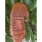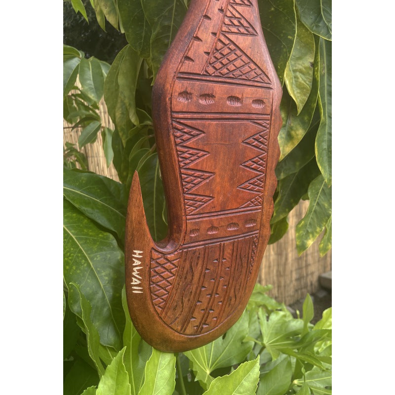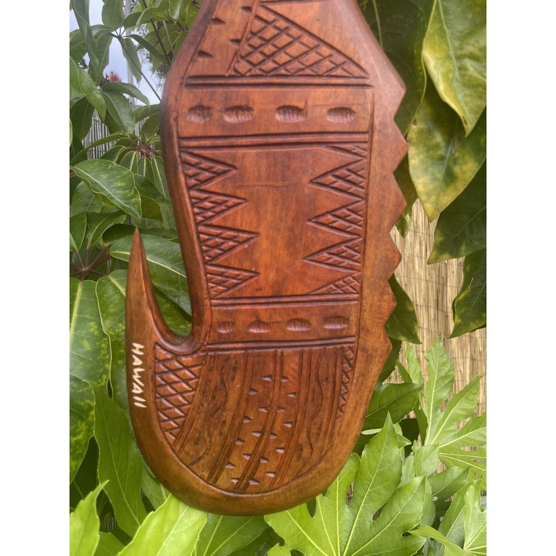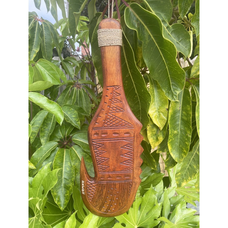 A beautiful Polynesian Replica Club in a natural finish. This club could do some serious damage way back when, but now it's a beautiful Polynesian Heritage piece of artwork. Features an etching of the word Hawaii on top of club. This replica measures approximately 20 inches long and is carved from single piece of wood. Sennit fiber on handle.