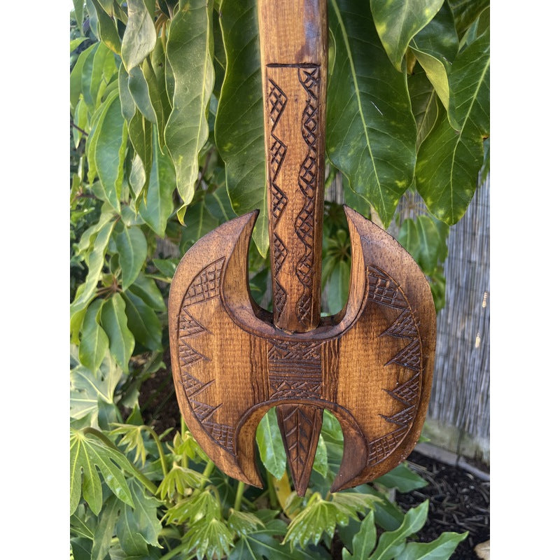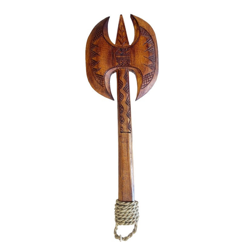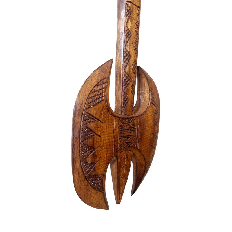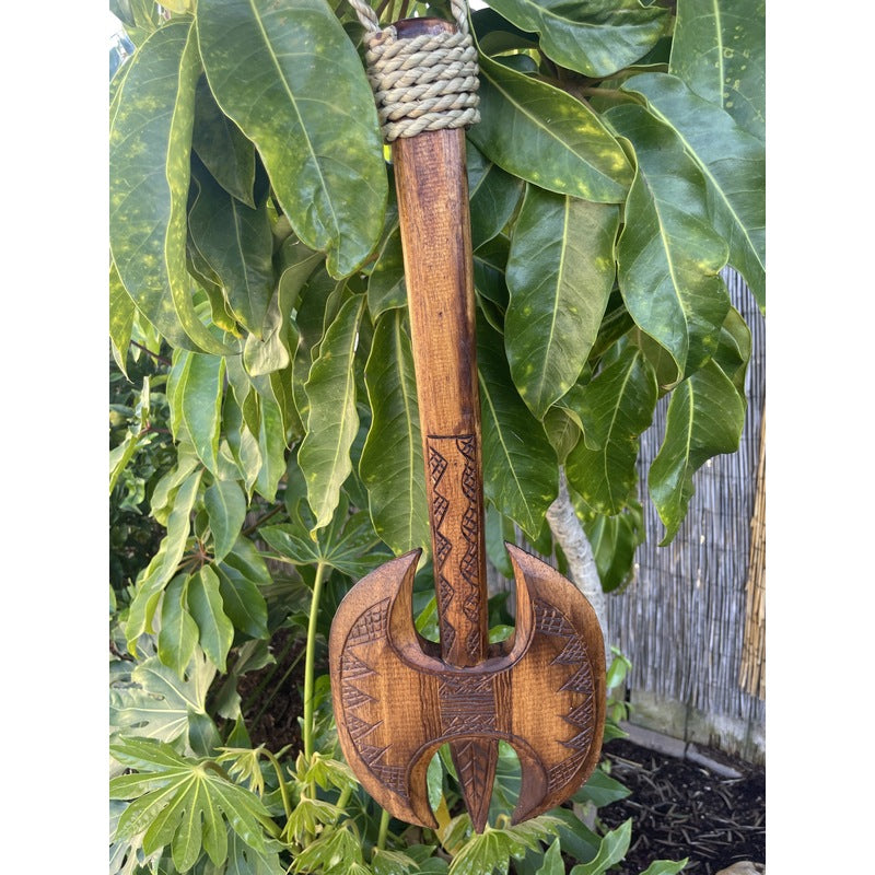 A beautiful Polynesian Heritage Replica Double Axe Club in a natural finish. This club could do some serious damage way back when, but now it's a beautiful Polynesian Heritage piece of artwork. This replica measures approximately 20 Inches long and is carved from single piece of wood. Sennit fiber on handle.