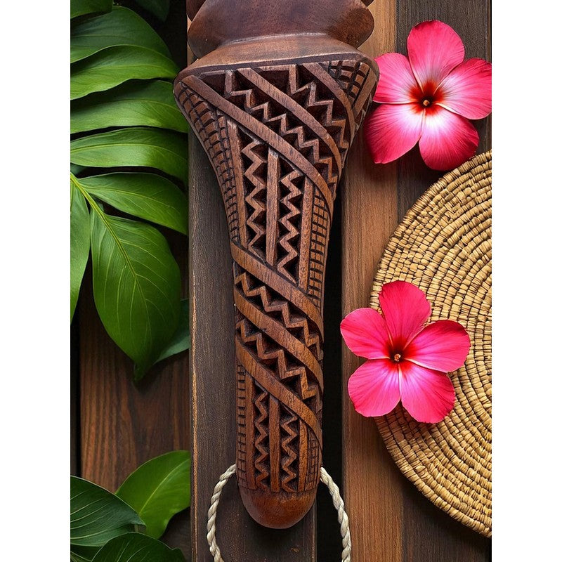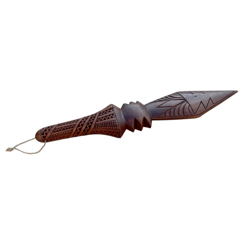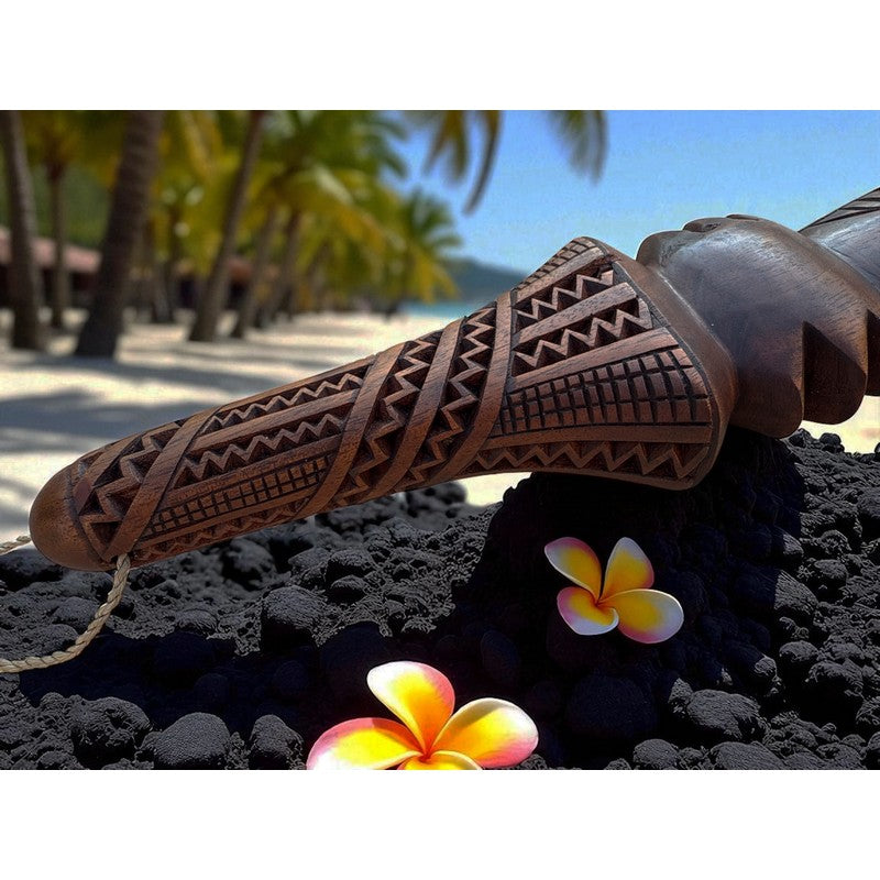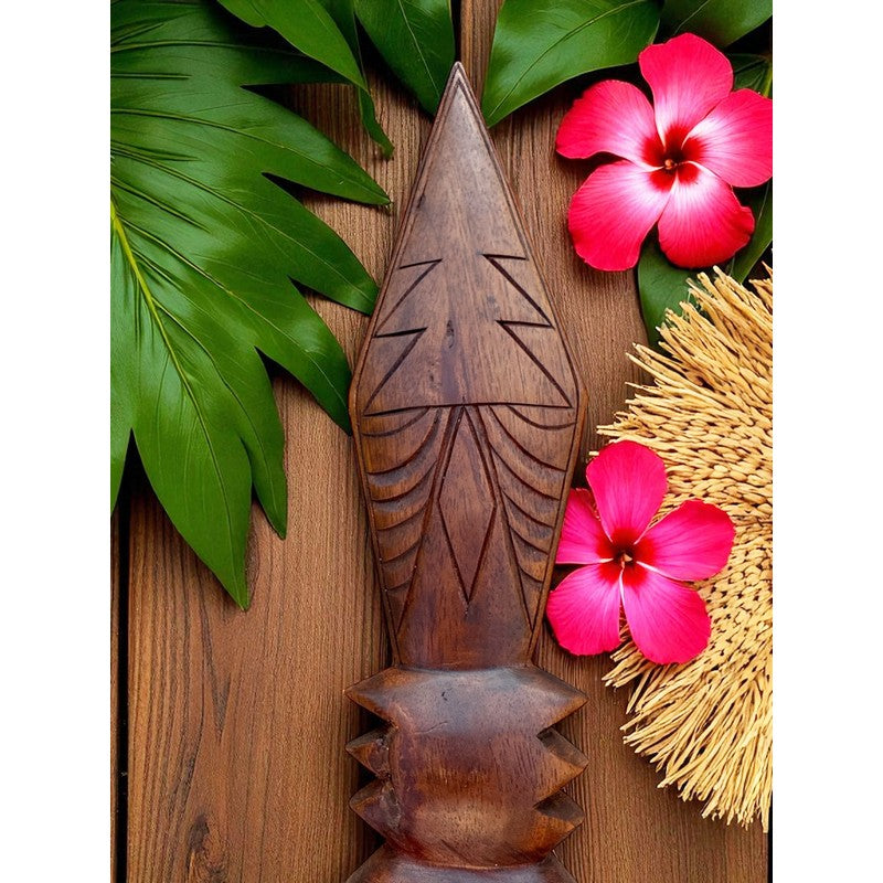Crafted with precision and reverence for Polynesian heritage, this premium replica spear club from Makana Hut is a true work of art. Hand-carved from a single piece of rich mahogany wood, the spear features intricate carvings along the handle and traditional Polynesian engravings along the shaft, each detail reflecting the warrior spirit and cultural artistry of the islands.