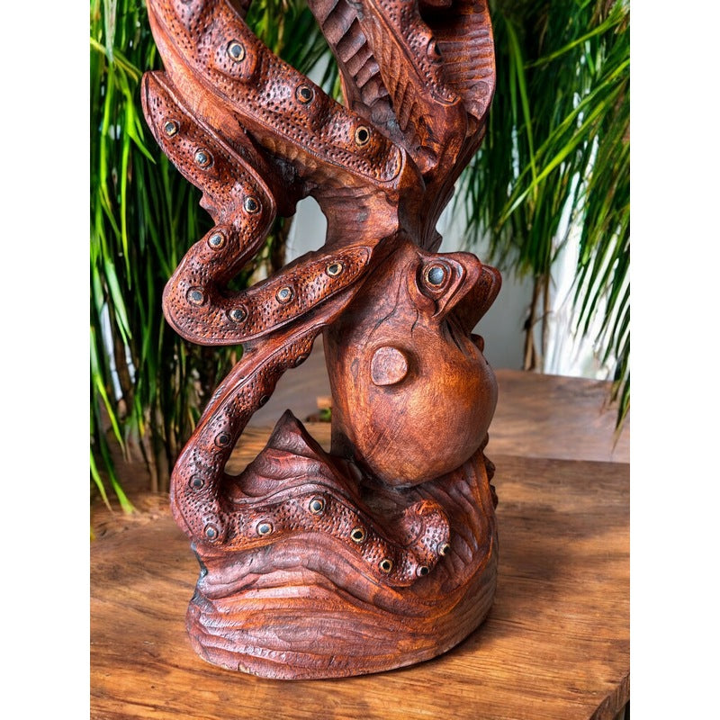 This exquisite piece showcases two He'e, the Hawaiian word for octopus and features a fish swimming between the tentacles, masterfully hand-carved into wood. In Hawaiian culture, the He'e, also known as Tako, is a powerful and symbolic creature. It is closely associated with Kanaloa, the Tiki god of the ocean, revered as a navigator and protector of the seas.
