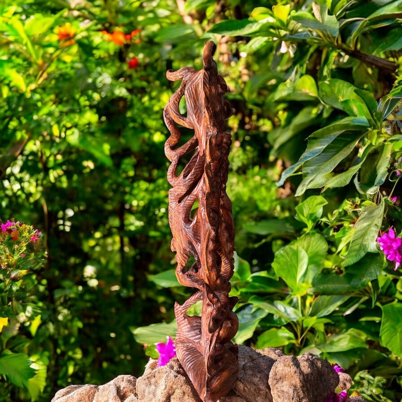 This artwork is not just a visual treasure but a connection to the rich traditions and mythology of the Hawaiian Islands. It stands approximately 40 inches tall and 12 inches wide and carved out of monkey pod wood.