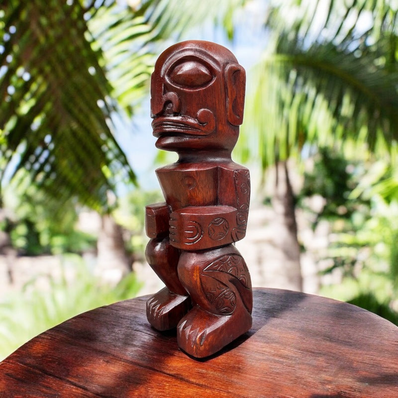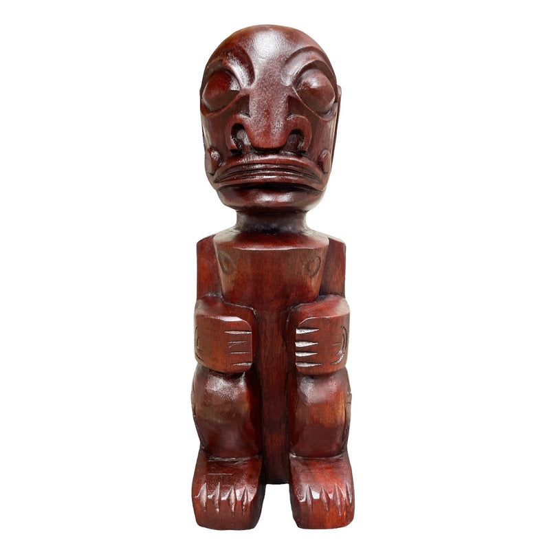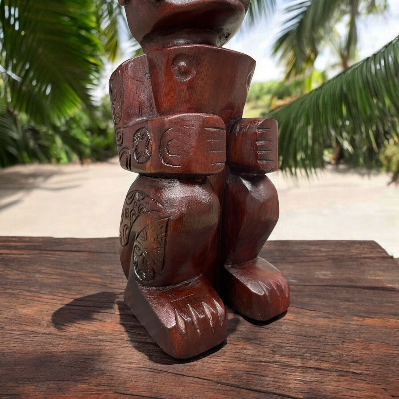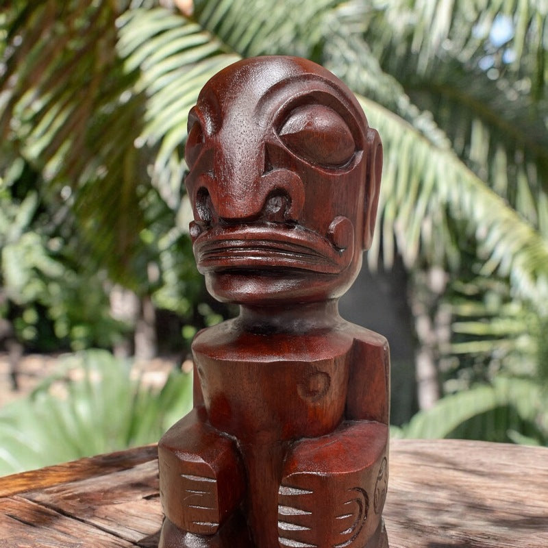 This 12-inch Tahitian Tiki Figure is a beautiful example of traditional hand carving and features a stunning stained finish. In the late 19th century, the ban on Tahitian Idols by London missionaries made these artifacts rare and highly sought after.